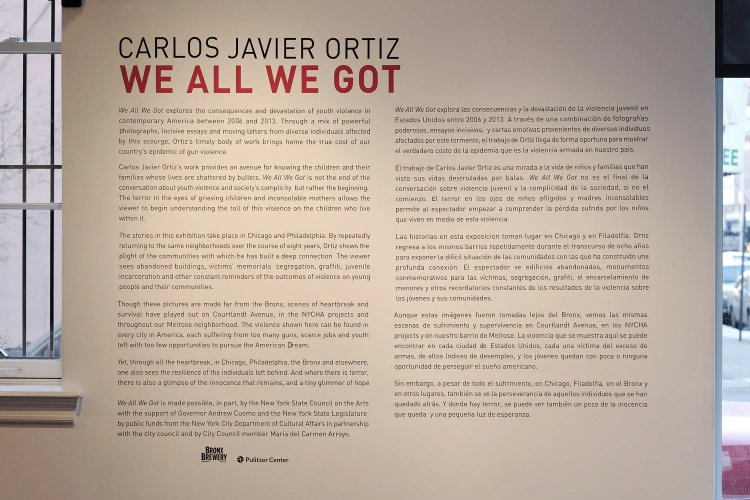 Logan Center for the Arts, University of Chicago 2016Following its debut at the Bronx Documentary Center, We All We Got by Carlos Javier Ortiz was presented at the Logan Center for the Arts in Chicago. This multimedia exhibition investigates the consequences of gun violence on American youth through documentary photography, short films, and text. Drawing from years of work embedded in communities across Chicago and beyond, Ortiz offers an intimate and unflinching look at the cycles of trauma, systemic neglect, and the enduring strength of families affected by violence.